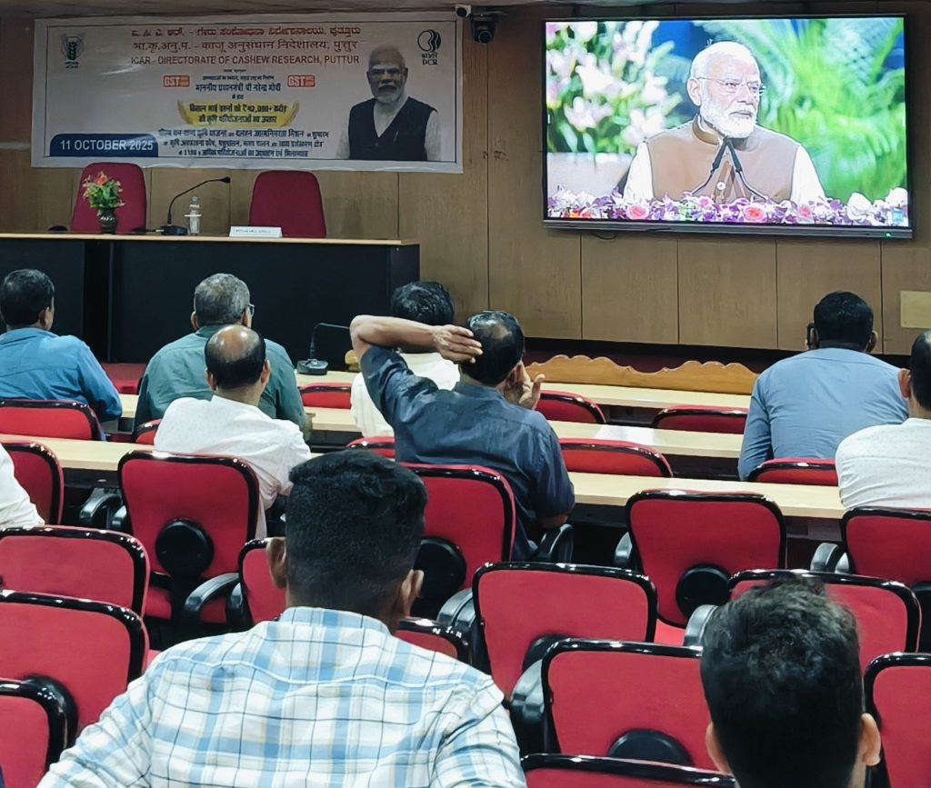 The Hon’ble Prime Minister Shri Narendra Modi in a special Krishi programme organised at the Indian Agricultural Research Institute in New Delhi on 11th October 2025, launched Pradhan Mantri Dhan Dhanya Krishi Yojana (PM-DDKY), a landmark initiative for transforming India’s agricultural landscape. The programme with an outlay of Rs. 24000 crore is designed to catalyse growth in 100 agri-districts through saturation-based convergence of 36 Central schemes across 11 Ministries, for a period of six years starting FY 2025–26. During the event, Prime Minister also launched Mission for Aatmanirbharta in Pulses with an outlay of Rs. 11,440 crore and dedicated projects and schemes worth over Rs 42,000 crore in Agriculture and allied sectors. The event was livestreamed at ICAR-Directorate of Cashew Research, Puttur from 11.30 am