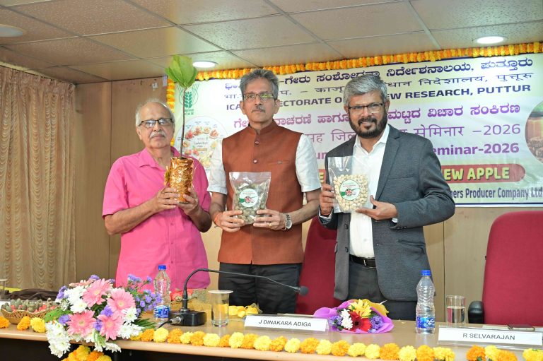 ICAR- Directorate of Cashew Research (DCR), Kemminje Puttur celebrated Cashew Day- 2026 on the theme “Value Addition of Cashew Apple” and organised Cashew Day cum District Level Seminar on 11-03-2026 at DCR, Puttur. As a Chief Guest on the occasion Dr. Selvarajan, Director, ICAR- National Research Centre for Banana, Tirucharapalli appreciated the achievement of the institute and AICRP ON Cashew centres for releasing more than 66 cashew varieties throughout major cashew growing regions since the inception of Institute. He also suggested that out of 60,000 tons of cashew apple production per year only 1% is used for value added products. The awareness about the cashew apple value addition should be created among cashew farmers. He also appreciated the activities of the ABI of the institute. As a guest of honour Dr. Femina, Director, DCCD Kochi appreciated the theme of the event and spoke about the nutritional value of cashew apple-based products and creating awareness among the public is need of the day. She also discussed about various schemes as well as credit support provided by government to start up FPO’s and other programmes. Shri Shree Padre, Executive Director, Adike Pathrike as a Guest of Honour discussed about the cashew value added products produced by various farmers and success stories of entrepreneurs from different parts of country in cashew apple value addition products and different ways of marketing them in various public places.