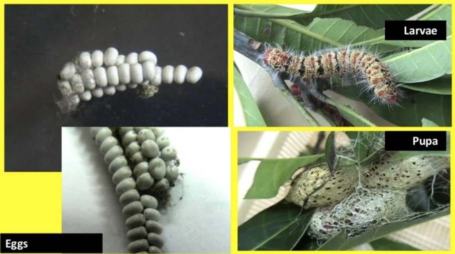 In the early stage, the larvae are found congregated on the under surface of the leaves, later they get dispersed, but restrict its feeding on its neighbouring trees.