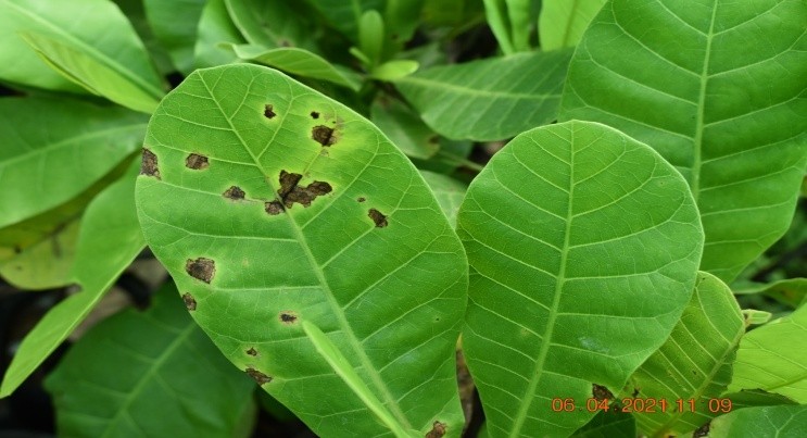 - The Cashew Leaf Blight (CLB) disease caused by Neopestalotiopsis clavispora in nursery conditions with 25-30% disease incidence, was reported. The disease symptomology, cultural and morphological characterisation of the pathogen and multigene analysis for identification of the pathogen up to the species level were documented