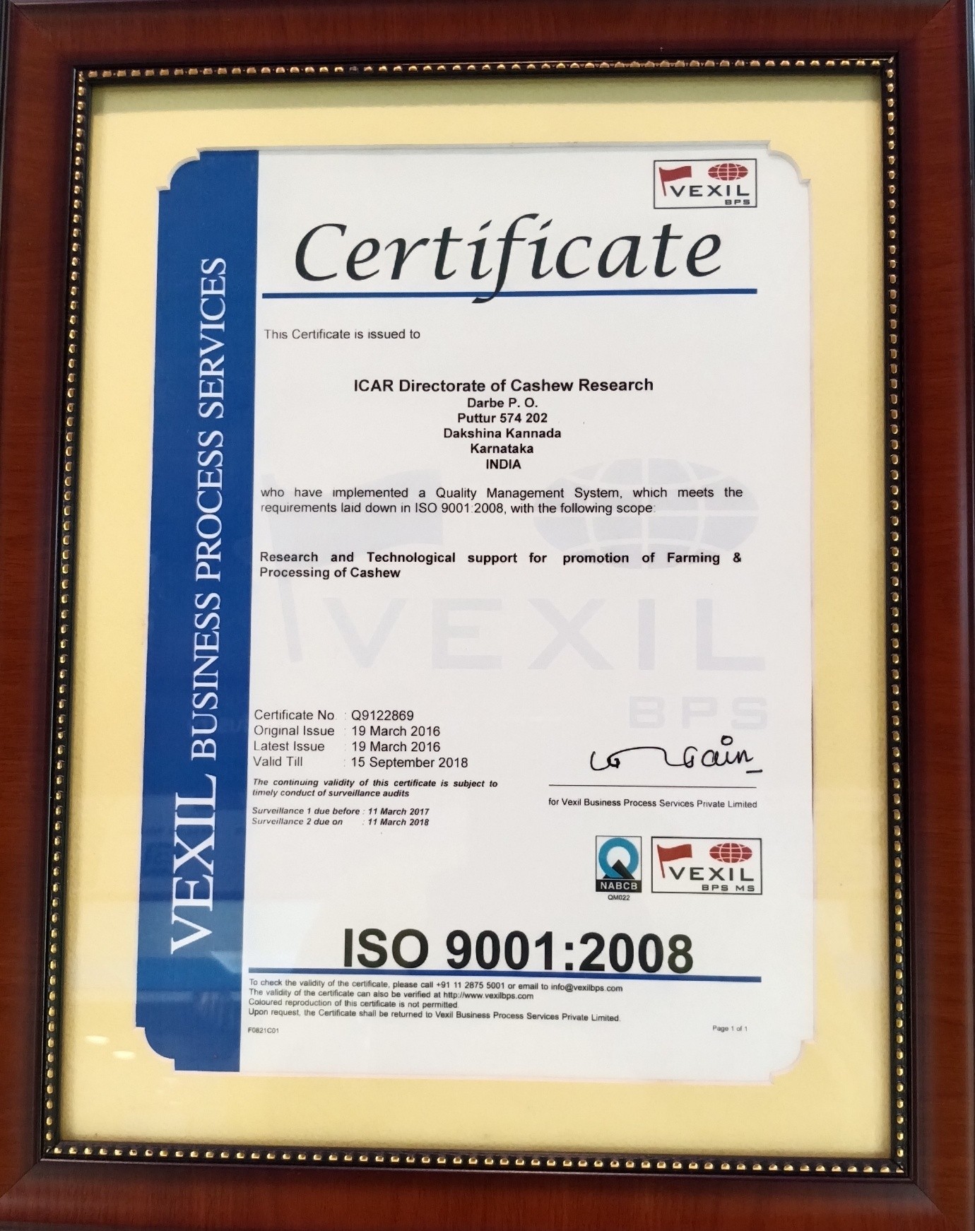 • Certificate of Accreditation (For cashew nursery), Directorate of Cashewnut and Cocoa Development from 13.10.2019 to 12.11.2020
