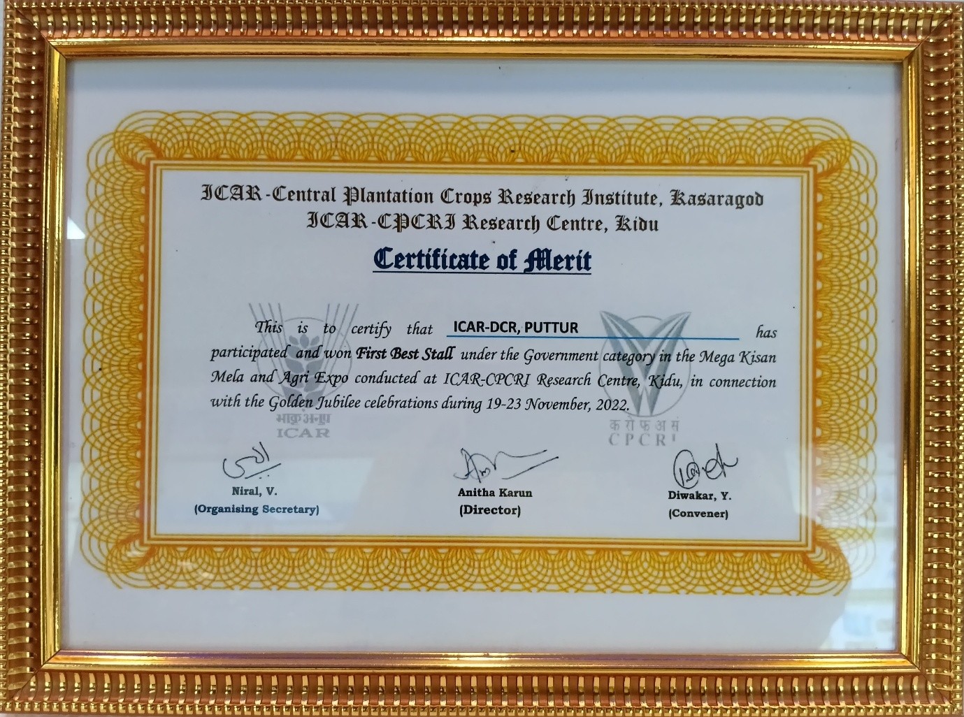 • First Best stall Award, Mega Kisan Mela and Agri Expo conducted at ICAR-CPCRI Research Centre Kidu, 19-23, November 2022