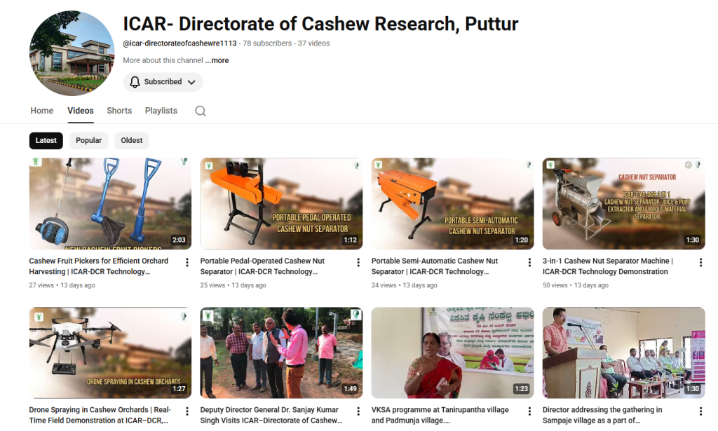 Extension is strengthened in cashew through social media, and a Facebook page for the dissemination of the latest cashew information and technical knowledge is created. All HRD programmes and farmer awareness programmes conducted at the Directorate were given wide publicity through the DCR Facebook page. An exclusive YouTube page is also created for hosting the videos on different technologies of the institute.